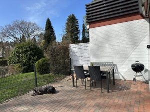 Die nach Süden ausgerichtete Terrasse ist eingezäunt, so dass Du Deinen Hund zumindest ein paar Meter ohne Leine ins Freie lassen kannst.