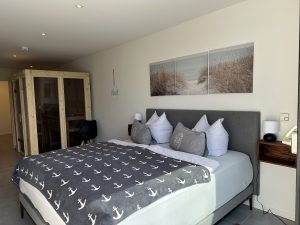 Auf ca. 65 qm Wohnfläche ist ausreichend Platz für bis zu vier Urlauber: Boxspringbett von Swiss Sense im Schlafzimmer und eine hochwertige Schlafcouch im Wohnzimmer